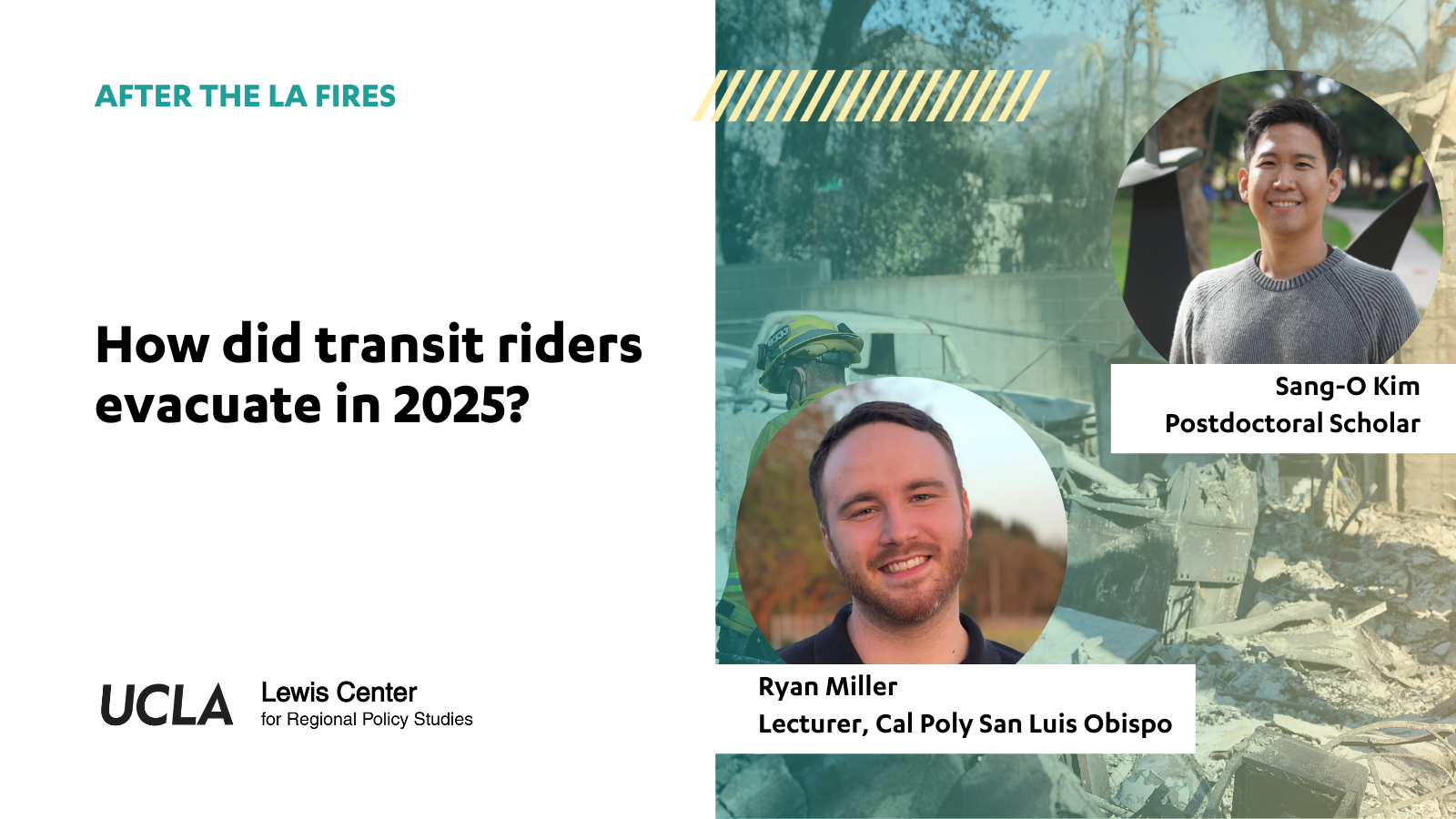 Part 1: How did transit riders evacuate in 2025? This webinar presents findings on how transit riders in Los Angeles County evacuated during the 2025 fires and how they would evacuate in future fires. Based on a February 2025 survey of transit riders who evacuated, the research highlights evacuation experiences, emergency preparedness, and recommendations