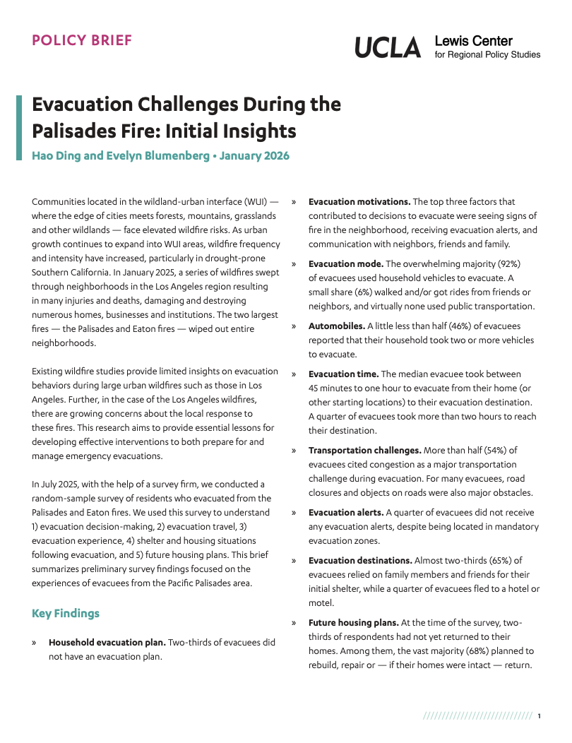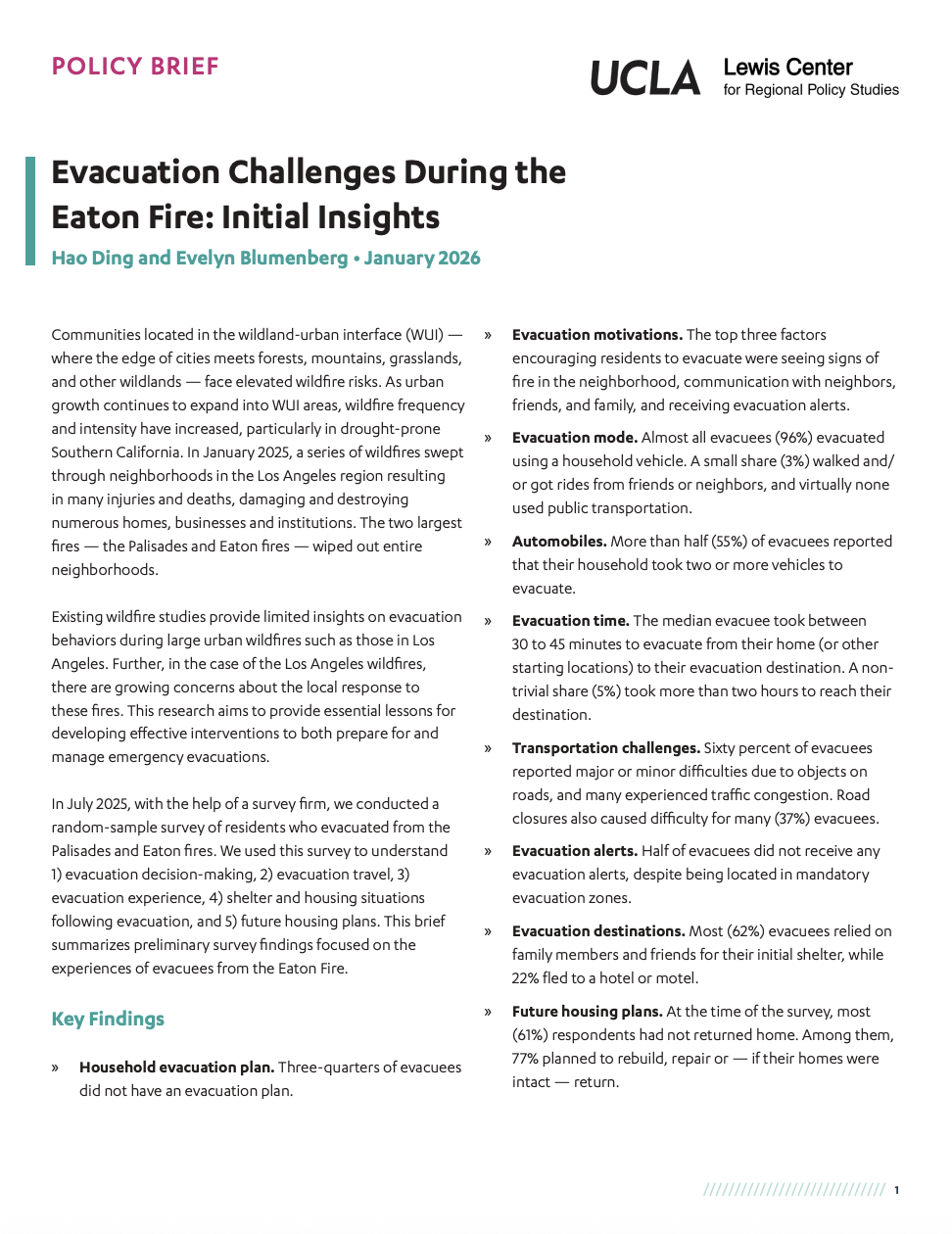 Few wildfires had previously impacted large urban areas as the 2025 Los Angeles fires. The scale, destruction, and effects on human lives in the Palisades and Eaton fires, in particular, highlighted the need to understand better how people and planning respond to and can prepare for future disasters. In response, the Lewis Center scholars, often in partnership with scholars outside of UCLA, are embarking on a suite of projects to understand the local context in these communities and the transportation and housing responses for affected people, as well as provide suggestions and guidance for rebuilding efforts and future community preparedness.